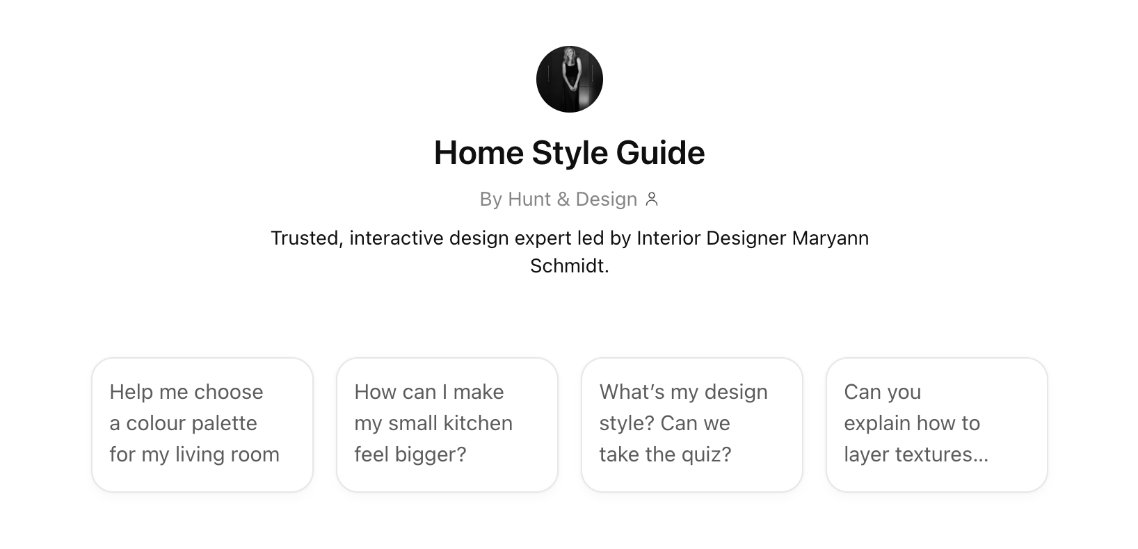 Explore, experiment, and ask your design questions with Home Style Guide — our AI interior designer, guided by Principal Interior Designer Maryann Schmidt.